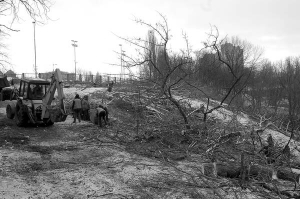Деревья начали валить 28 января в 9.00. Рабочие расчищали территорию на склоне Черепановой горы выше многоэтажки на Анри Барбюса, 5в. Участок огородили зеленым деревянным забором. По плану реконструкции спорткомплекса "Олимпийский" к Евро-2012 на этом месте должны построить подстанцию, которая будет обеспечивать стадион электроэнергией. Стоимость проекта - 319 млн грн.