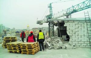 Два лишних этажа возведены из пеноблоков. Оттуда видно ул. Крещатик и площадь Независимости, купола церквей Киево-Печерской лавры и Софийского собора. На крыше — кучи битых блоков и куски жести. Бригада мужчин в засоленных жилетах сбрасывают их в контейнер. Цепляют на крючок крана, который спускает мусор во внутренний двор.