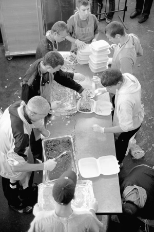 Этажом выше, около кухни, собираются восемь женщин. Распаковывают судки с пищей. Быстро едят стоя.