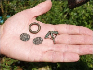61-летний Николай Йолтухович , местный краевед, показывает нам найденные польские медяки-"баратинки", застежку от одежды в виде маленького арбалета и кольцо для ремешков военной сбруи.