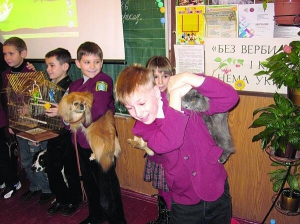 На урок девять учеников 4-А класса винницкой физико-математической гимназии №17 принесли домашних животных. Учительница решила, что так будет интереснее о них рассказывать. В классе 30 детей.
