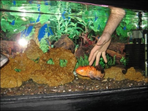 — Очень любознательная. Приблизьте палец и проведите по стеклу. Рыбка будет плавать за пальцем, — объясняет Александр. — Год назад цихлозома лимонная убила другую цихлозому. Не все рыбы даже одного вида могут жить вместе. А вот с сомом она мирно уживается.