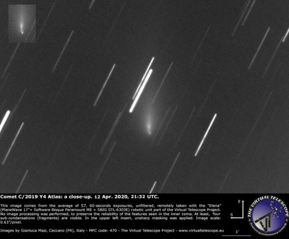 "Ядовитая комета" C/2019Y4(ATLAS) распалась по пути к Солнцу. Как минимум 4 ее фрагмента астрономы наблюдали в субботу и воскресенье, 11 и 12 апреля 2020 года.