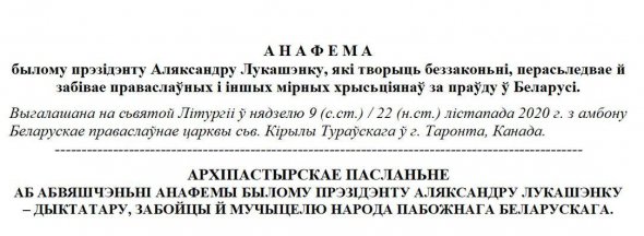 Текст отлучения называется "Анафема бывшему президенту Александру Лукашенко, который творит беззаконие, преследует и убивает православных и других мирных христиан за правду в Беларуси".