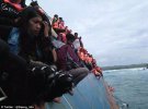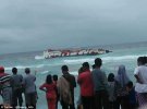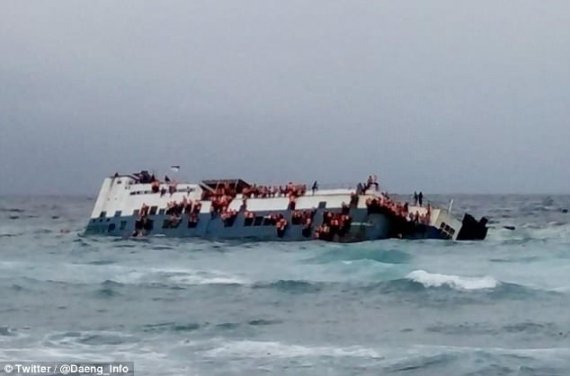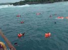 На фото, опубликованных пассажирами, судно легло на борт под давлением 13-метровых волн. Напуганные люди прыгали в воду и цеплялись за веревки, которые свисали с бортов парома.