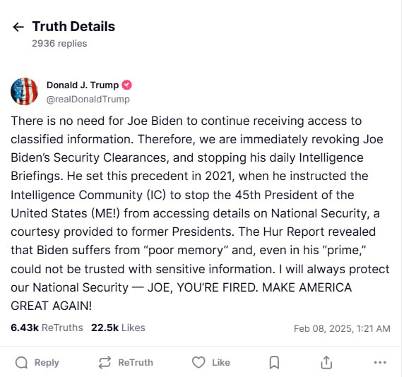 "Джо Байдену нет необходимости продолжать получать доступ к секретной информации. Поэтому мы немедленно отзываем допуски Джо Байдена к секретной информации и прекращаем его ежедневные разведывательные брифинги.", - написал Трамп.