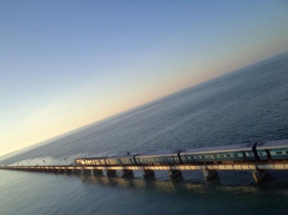 Это железнодорожное полотно проходит над Индийским океаном от материка к острову Рамесварам. Путь над морской гладью длиной около полутора километров. Она была возведена примерно 100 лет назад. С тех пор этот путь почти не ремонтировался.