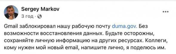 "Gmail заблокировал нашу рабочую почту duma.gov. Без возможности обновления данных. Будьте осторожны, храните личную информацию на других ресурсах", – написал Марков.