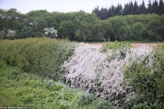 Тысячи мелких гусениц обплелилы паутиной растения в британском городе Рокингем-Форест, графство Нортгемптоншир. Это похоже на декорации к фильму ужасов, говорят журналисты.