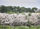 Белым или серым шелковым полотном оказались участки живых изгородей, иногда целые деревья. Неизвестно, какие условия способствуют вспышке такого поведения насекомых, но теплое лето может их поощрять. Шелковое одеяло защищает гусениц и их еду от врагов, объясняет Daily Mail.