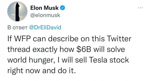"Если программа ООН сможет точно описать в Twitter, как именно шесть миллиардов долларов решат проблему голода в мире, я продам акции Tesla прямо сейчас", - написал Маск.