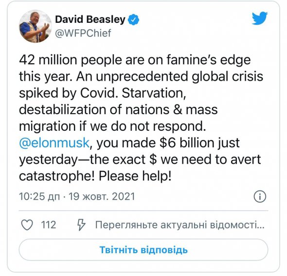 Бизли заявил об обострении глобального кризиса на фоне Covid-пандемии. 42 млн человек находятся на грани голода, написал он в Twitter 19 октября и тэгнул Маска.