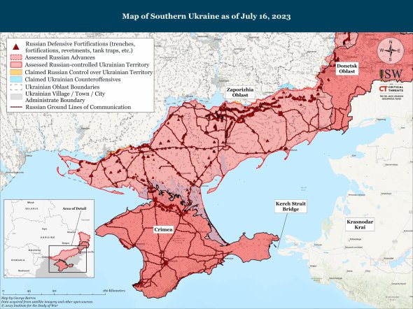 Аналитик Института изучения войны Джордж Баррос написал в Twitter, что "Россия теперь будет иметь только одну наземную линию снабжения – прибрежную магистраль возле Азовского моря для поддержки или эвакуации своих десятков тысяч войск в оккупированном Херсоне и Крыму".