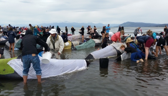 В Новой Зеландии на берег бухты Голден-Бей выбросились 416 китов. Сотни животных погибли к тому времени, когда волонтеры прибыли на место, сообщает природоохранный департамент страны.
