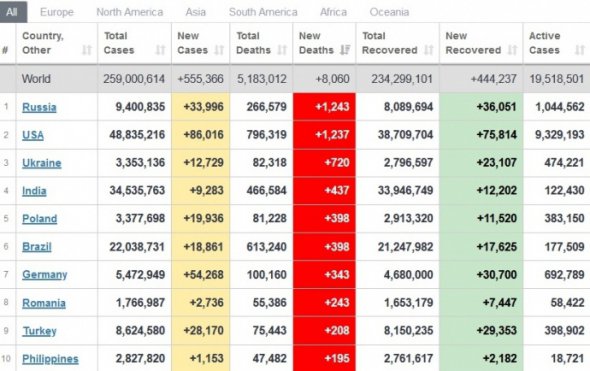 В течение суток 22 ноября диагностировали более 555 тыс. новых Covid-случаев, свидетельствуют данные Worldometers. Больше всего смертей за сутки от коронавируса в России, США и Украине.