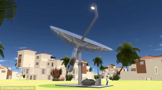Тепловая солнечная батарея имеет вид тарелки диаметром 14 метров. Покрыта зеркалами, которые фокусируют солнечные лучи на устройстве в центре тарелки. Нагревают его до 750° С. Тепло превращается в энергию.