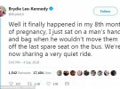 Беременная женщина попросила мужчину убрать свои вещи с соседнего сиденья, чтобы она могла сесть. Мужчина отказался. Рукой он придерживал сумку . Тогда Брайди просто села сверху на его руку и сумку.
