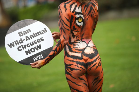 Американская модель и актриса Джоанна Крупа устроила одиночный пикет у здания британского парламента в Лондоне против использования животных в цирках по всему миру. Девушка нанесла на свое тело рисунки, имитирующие шкуру тигра. В руках она держит табличку с надписью "Запретим мировые цирки с животными сейчас".