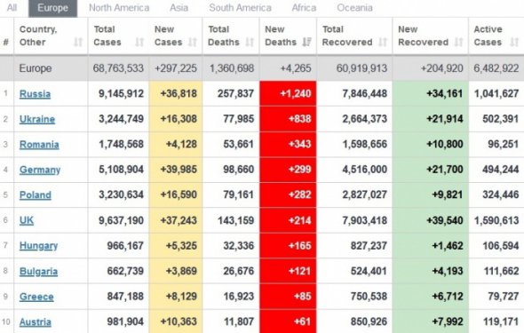 По суточной смертности от коронавируса в Европе лидируют РФ, Украина и Румыния. В мире по этому показателю лидирует США.