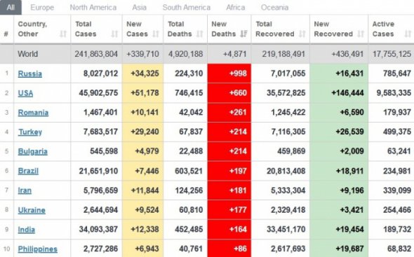 С начала пандемии подтвердили более 4,9 млн смертей от Covid-19. В мире по суточной смертности лидируют Россия и США. Украина на восьмом месте в мире и на четвертом в Европе. Сейчас в мире насчитывается почти 18 млн активных случаев заболевания. Вылечились более 219 млн человек.