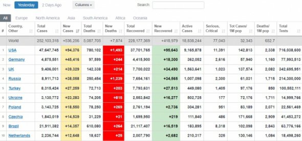 По состоянию на утро 11 ноября в мире зафиксировали более 252 млн случаев заражения коронавирусом. Больше всего больных за все время пандемии обнаружили в США (47 млн), Индии (34 млн) и Бразилии (21 млн).