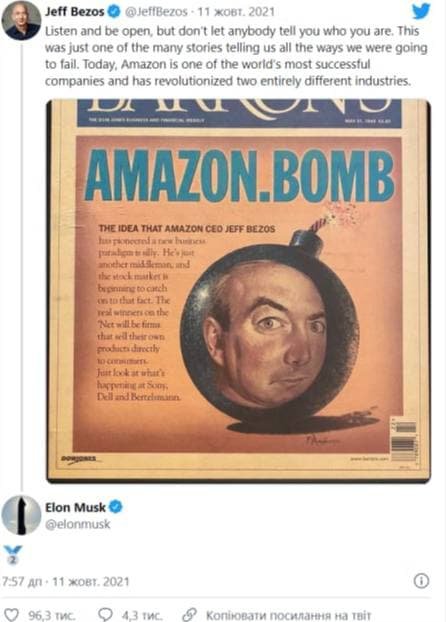 Маск прислал Безосу "серебряную медаль" в Twitter, комментируя его сообщение об Amazon. Накануне Безос обнародовал фото из публикации в Barron's за 1999 год, где раскритиковали стартап Amazon, назвав проект "бессмысленной бизнес-парадигмой".