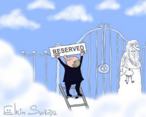 Художник-карикатурист изобразил президента России Владимира Путина в раю с табличкой "Зарезервировано".