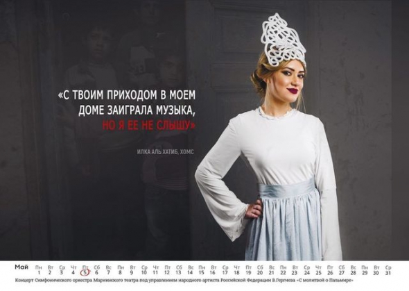 Пропагандистский календарь с сирийскими красавицами, восхваляющими достоинства российских мужчин, появился в РФ перед Новым годом. Женщины одеты в стилизованные кокошники. Фотография сопровождается обращением к российскому воину.