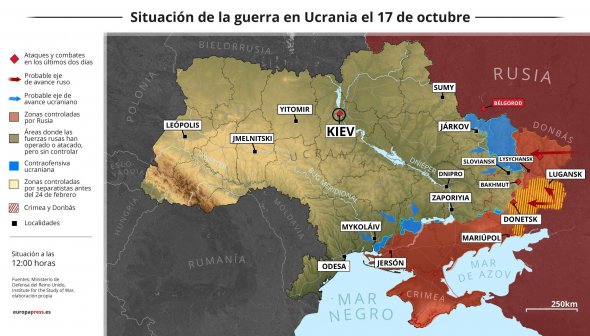 Украина использовала точные ракеты большой дальности, предоставленные США, для обстрела мостов через Днепр, командных пунктов и складов с боеприпасами и горючим. Украинские войска продвигались к Херсону с севера рывками с момента начала наступления в конце августа. Наступление на юге последовало за молниеносным наступлением на северо-востоке страны, где в прошлом месяце украинцы захватили большие участки территории.