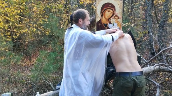 "На сваленное дерево поставили ящик из-под боеприпасов, проложив его изнутри полиэтиленовым мешком. Для ног принесли картонную коробку, которую также проложили мешком", – заявил российский протоиерей.