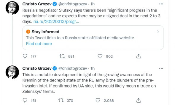 "Это значительное событие на фоне растущего осознания Кремлем дряхлости российской армии и ошибок разведки накануне вторжения. Если украинская сторона подтвердит — это, скорее всего, будет означать перемирие на условиях Зеленского", — написал Грозев.