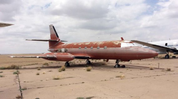 Ржавый самолет "короля рок-н-ролла" стоит неподвижно 36 лет в американском Росвелле, штат Нью-Мехико. На фото видно, что краска облущилась и металл поржавел, панель приборов разобрана, двигатель отсутствует. Выдуманый певцом дизайн салона включает красные кресла, такого же цвета ковер и украшенные золотом деревянные детали.