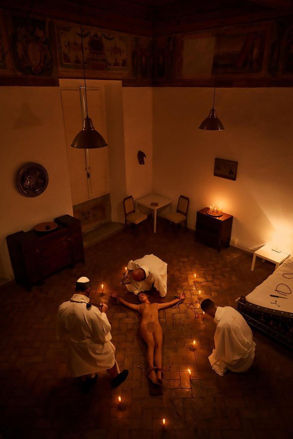 На другой фотографии Мариса распятая на кресте, в то время как человек в белых одеждах рисует кровью крест на ее лбу.