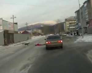 Собака стремительно потащила ребенка за собой. Держась за поводок, девочка на животе переехала по обледеневшей дорогу прямо перед колесами автомобиля. Водитель в последний момент успел притормозить. После такого нестандартного "перехода" ребенок поднялся на ноги и, как ни в чем не бывало, пошел дальше со своим четвероногим другом.