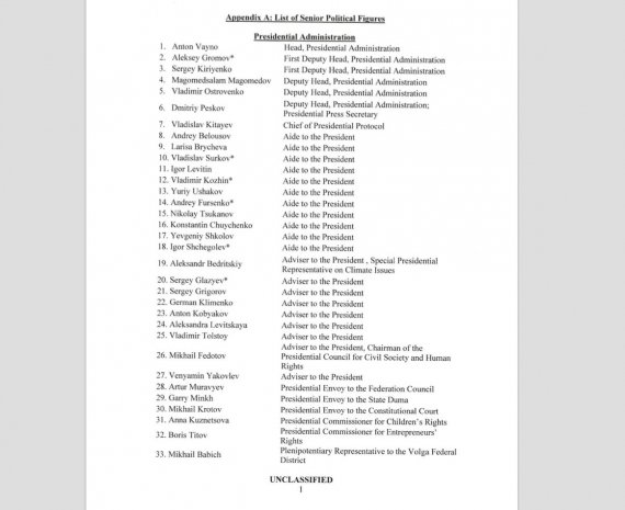 Министерство финансов США представило Конгрессу "кремлевское досье", в перечне которого 210 фамилий.