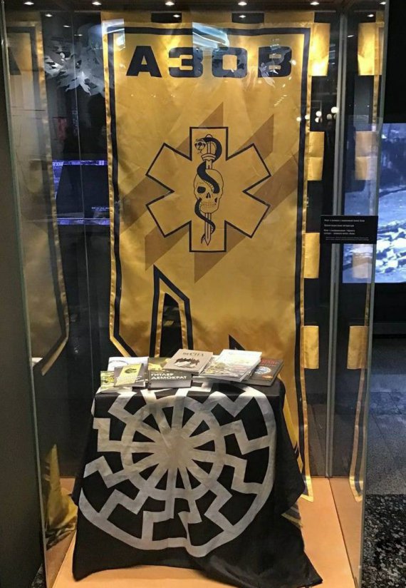 В московском Музее победы открылась выставка "Обычный нацизм". В экспозиции представлены украинская символика, книги, флаги, главный экспонат - флаг полка "Азов".