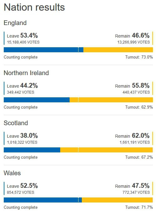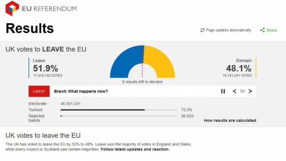 51, 9% британцев на референдуме проголосовали за выход из ЕС.