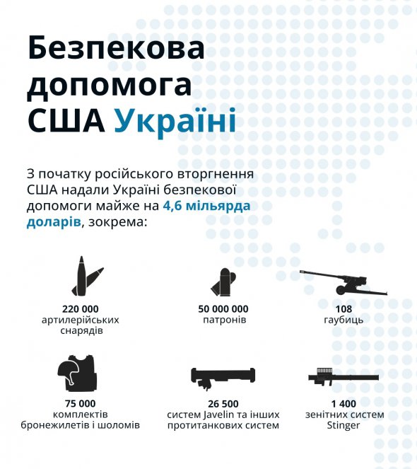 В частности, США предоставили Украине 26 500 систем Javelin и других противотанковых систем, 1400 зенитных систем Stinger, 108 гаубиц, 220 тыс. артиллерийских снарядов и 50 млн патронов.
