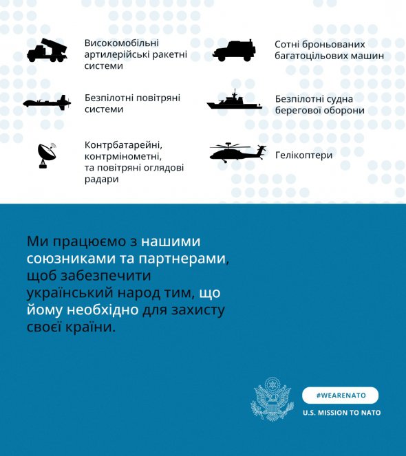 Военная помощь США включает также высокомобильные артиллерийские ракетные системы, сотни бронированных многоцелевых машин, беспилотные воздушные системы, беспилотные судна береговой охраны, контрбатарейные, контрминометные и воздушные обзорные радары и вертолеты.