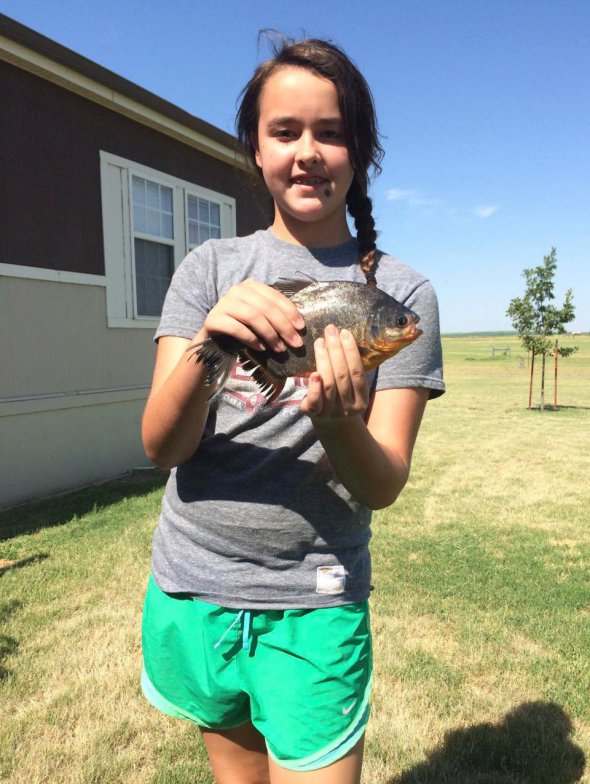 Школьница Кеннеди Смит, 11 лет, из американского штата Оклахома выловила в озере Форт Кобб редкую рыбу Паку с человеческими зубами.