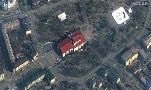 На спутниковом снимке, сделанном 14 марта и опубликованном в среду компанией Maxar Technologies, видно слова "Дети", написанные крупным шрифтом на земле возле здания театра.
