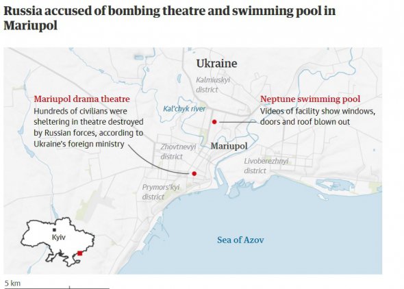 "Россию обвинили во бомбардировке театра и бассейна, в котором были мирные жители", The Guardian, Великобритания