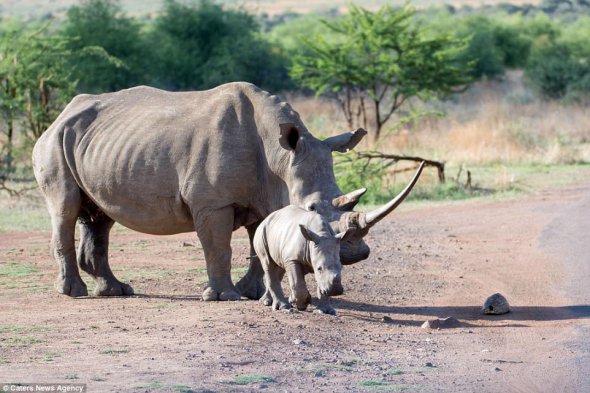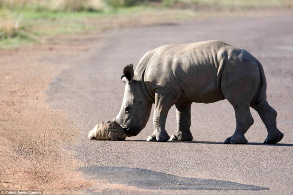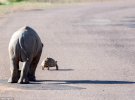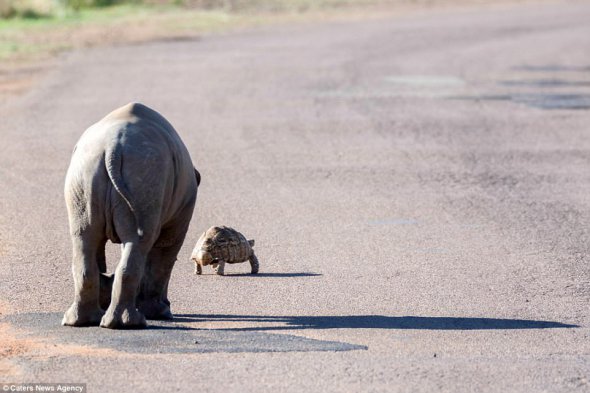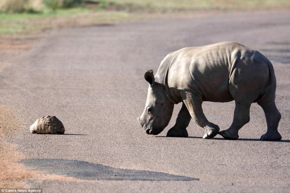 Детеныш носорога увидел черепаху которая переходила дорогу и решил ей помочь. Фото необычного поступка опубликовало Daily Mail
