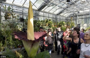 В оранжерее университета швейцарского города Базель впервые за 75 лет расцвел Титан Арум — самый крупный и самый вонючий цветок в мире. Он воняет тухлой рыбой или падалью. Из-за этого растение называют "трупным цветком". Резкий запах привлекает мух для опыления.