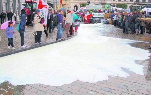 Фермеры-молочники из Франции, Германии и Италии собрались в среду перед зданием Европарламента в бельгийской столице Брюсселе и разлили тысячи литров молока. Так выразили недовольство переполненностью рынка молокопродуктов в ЕС и заниженными ценами на них. Привезли статуи коров в натуральную величину, раскрашенные в национальные цвета. Молоко сначала налили из молоковоза в большой брезентовый бассейн, а затем открыли, давая ему стечь в канализацию.