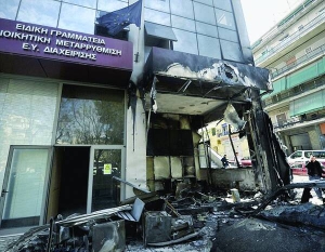 В ночь на понедельник около здания министерства административной реформы Греции в Афинах взорвалась небольшая бомба. Дотла выгорели первый этаж и несколько автомобилей, припаркованных рядом. По плану строжайшей экономии, это министерство должно сократить 150 тыс. госслужащих до 2015-го.