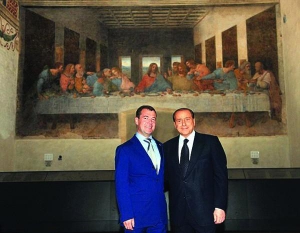Президент России 44-летний Дмитрий Медведев и премье р- мини стр Италии Сильвио Берлускони, 73 года, вопреки запрещению сфотографировались на фоне "Тайной вечери" — знаменитого полотна Леонардо да Винчи. Администрация музея в Милане специально для российского гостя позволила сделать снимки картины XV в.