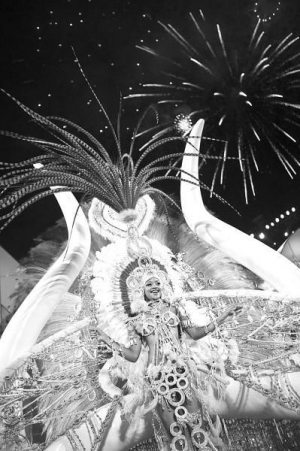 В первой колонне идет 27-летняя Мария Моунетто. На голове у нее корона из 10 тыс. желтых и красных паеток. На щеках приклеены цветные стразы.