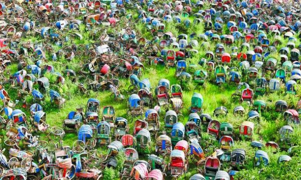 Сломанные велорикши лежат на свалке недалеко от столицы Бангладеш Дакки. На улицах этой бедной страны велорикш намного больше, чем машин. Для большинства людей это единственный доступный транспорт. Полицейские пытаются ввести технические требования и водительские права для водителей более миллиона рикш, которые каждый день выезжают на улицы Дакки. Половину ДТП в городе провоцируют именно они.