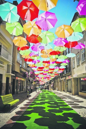 Пять тысяч разноцветных зонтиков развесили над центральной улицей португальского городка Агеда. Инсталляцию назвали "Небо в зонтиках".